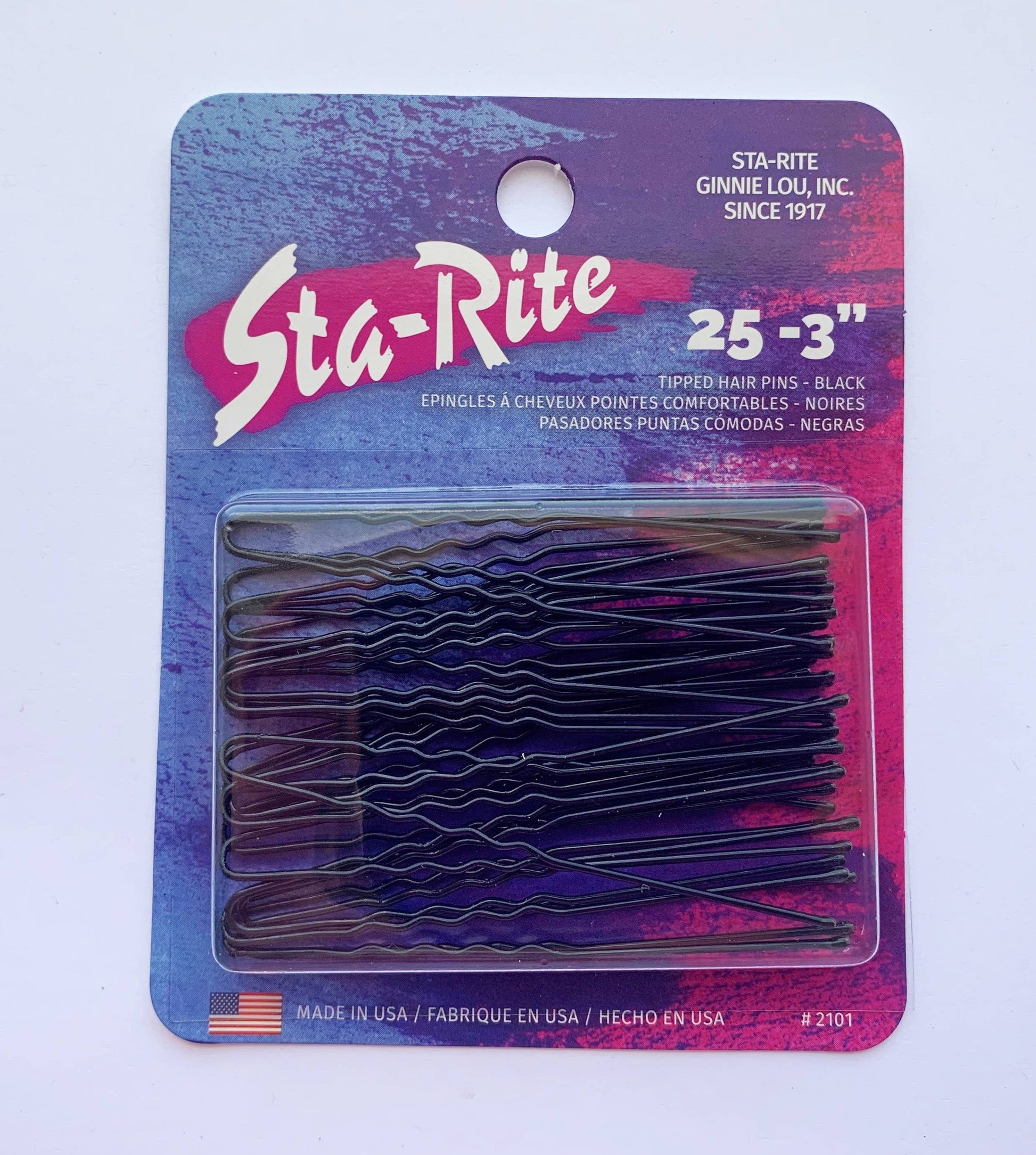 3” heavy tipped hairpins, 25 per card. Available in black, bronze, silver, and white. Made in the USA.