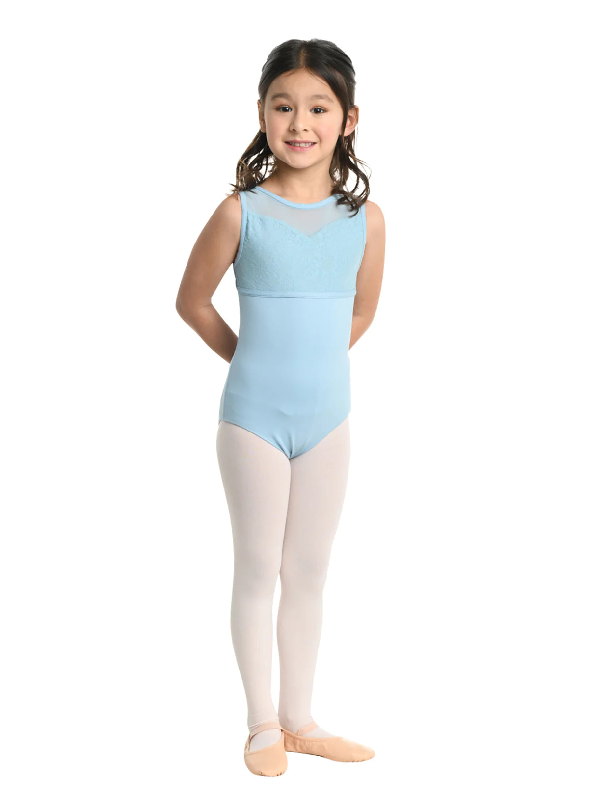 Tank leotard with sweetheart neck detail features lace and sheer mesh blocking. Back details include a low V-neckline, keyhole, and fixed bow. Fully front lined. Nylon/Spandex.